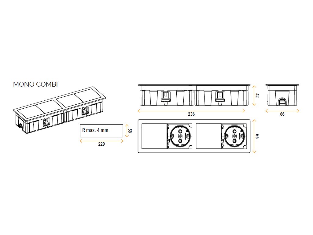 | Material: | Gehäuse und Steckdosen – selbstverlöschendes Polymer, Rahmen und Abdeckungen – Zamak |