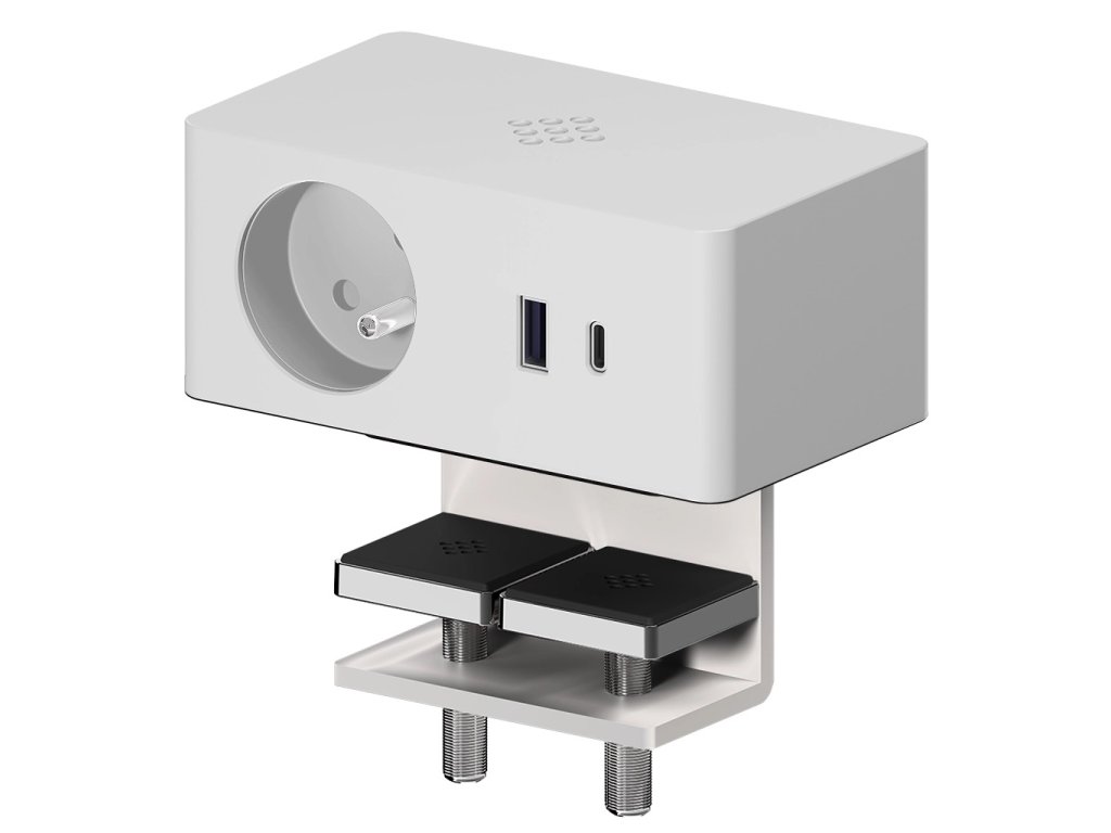 Elegante Tischsteckdose der Marke ASA. Bietet 1× Steckdose und 1× USB-Ladegerät (Typ A+C) und kabelloses Qi-Ladegerät und Professioneller Anschluss – Kabel mit GST-Stecker. Hergestellt aus selbstverlöschendem Polymer mit Soft-Touch-Oberfläche in Weiß. Dank des innovativen Schiebe-Befestigungssystems installieren Sie sie in wenigen Minuten ohne Werkzeug. Das Anschlusskabel ist mit einem GST-Stecker ausgestattet. Für den Anschluss an eine normale Steckdose ist ein Adapter erforderlich. Die ideale Lösung für Büros, Hotels und Zuhause.