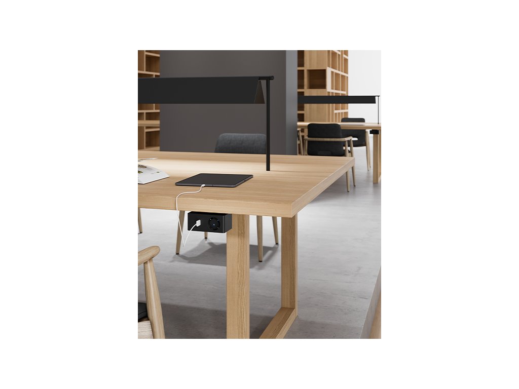 Elegante Tischsteckdose der Marke ASA. Bietet 2× Steckdose und 1× USB-Ladegerät (Typ A+C) und Professioneller Anschluss – Kabel mit GST-Stecker. Hergestellt aus selbstverlöschendem Polymer mit Soft-Touch-Oberfläche in Weiß. Dank des innovativen Schiebe-Befestigungssystems installieren Sie sie in wenigen Minuten ohne Werkzeug. Das Anschlusskabel ist mit einem GST-Stecker ausgestattet. Für den Anschluss an eine normale Steckdose ist ein Adapter erforderlich. Die ideale Lösung für Büros, Hotels und Zuhause.