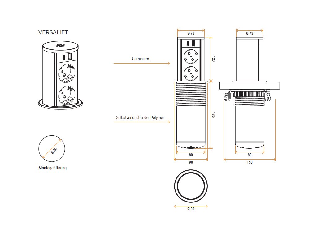 VersaLift von ASA Plastici ist eine hochwertige, versenkbare Steckdoseneinheit im italienischen Design, die Eleganz mit hoher Funktionalität kombiniert. Dank des kompakten Installationsdurchmessers von nur 80 mm lässt sich VersaLift problemlos in nahezu jede Arbeitsplatte integrieren und passt auch in Tischbeine mit einem Durchmesser von 100 mm. Die kleine Öffnung sorgt für mehr Platz auf der Arbeitsfläche und ermöglicht eine saubere, ordentliche und funktionale Lösung. Das elegante und moderne Design fügt sich harmonisch in jedes Interieur ein und ist geeignet für Küchen, Büros und Hotellobbys.