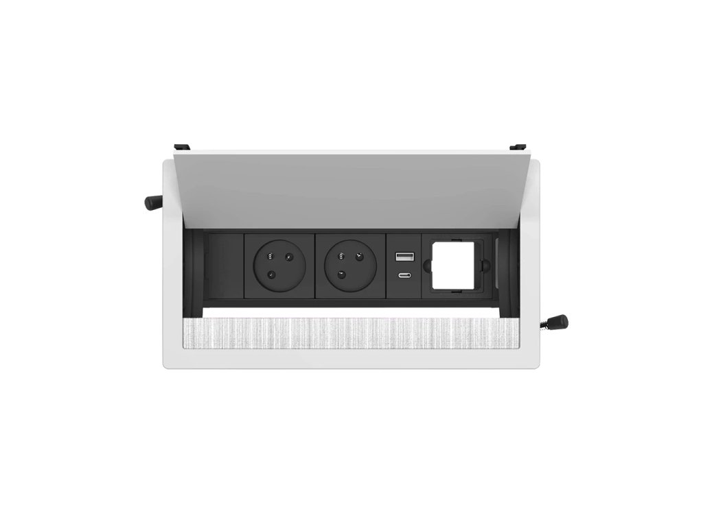 Das Modell DUAL 2.0 verfügt über eine Klappabdeckung, die Zugang von beiden Seiten des Tisches ermöglicht. Dies ist ideal für Besprechungsräume, in denen sich Personen gegenübersitzen, oder für gemeinsam genutzte Arbeitsflächen in Coworking-Centern. Jeder Benutzer hat einfachen Zugang zu Strom und USB-Aufladung.