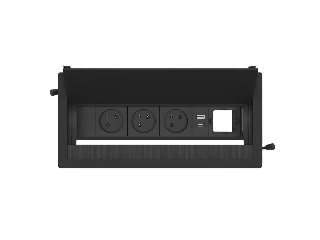 Das Einbau-Elektromodul ASA VERSAFLAP DUAL 2.0 in Schwarz stellt eine Premium-Lösung für die Integration von Strom und Datenports in die Tischplatte dar. Dank des Klappmechanismus bietet es beidseitigen Zugang, ideal für Konferenztische und gemeinsam genutzte Arbeitsflächen.