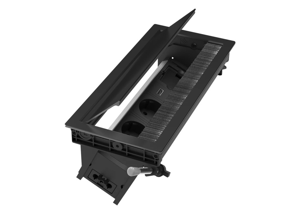 Das Einbau-Elektromodul ASA VERSAFLAP MONO 3.0 in Schwarz stellt eine Premium-Lösung für die Integration von Strom und Datenports in die Tischplatte dar. Die elegante versenkte Abdeckung mit Dämpfungsmechanismus sorgt für leisen und sicheren Betrieb.