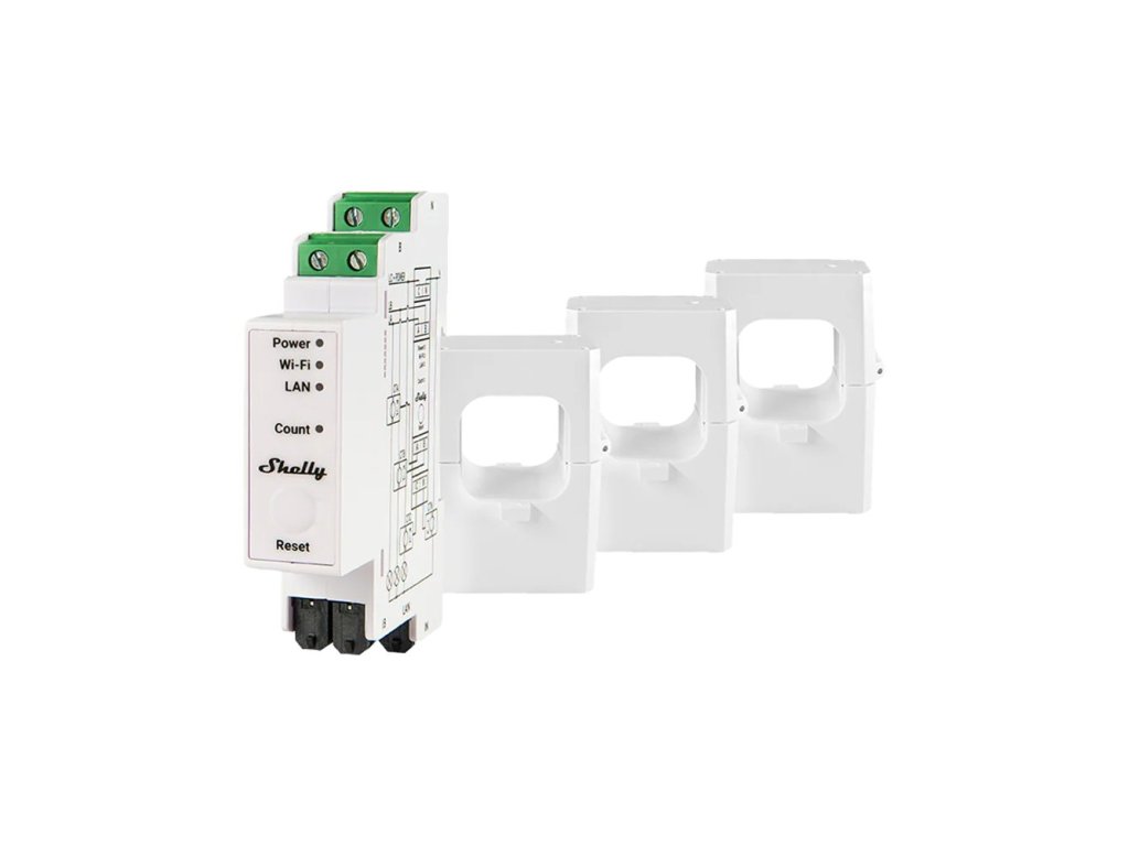 Der Shelly Pro 3EM‑400 ist ein professionelles, dreiphasiges Strommessmodul / Energiemessmodul, das für die Montage auf DIN-Schienen konzipiert wurde. Das Gerät unterstützt bis zu 400 A pro Phase über drei im Lieferumfang enthaltene Stromwandler-Klemmen und misst Spannung, Strom, Wirkleistung, Blindleistung und Energie in Echtzeit.